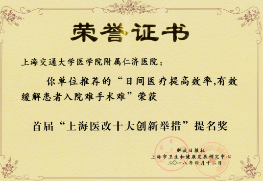 图片1:日间医疗项目获得2018年首届“上海医改十大创新举措”提名奖。仁济医院以日间医疗新型服务模式为抓手,提升运行效率,提高优质医疗资源服务可及性。