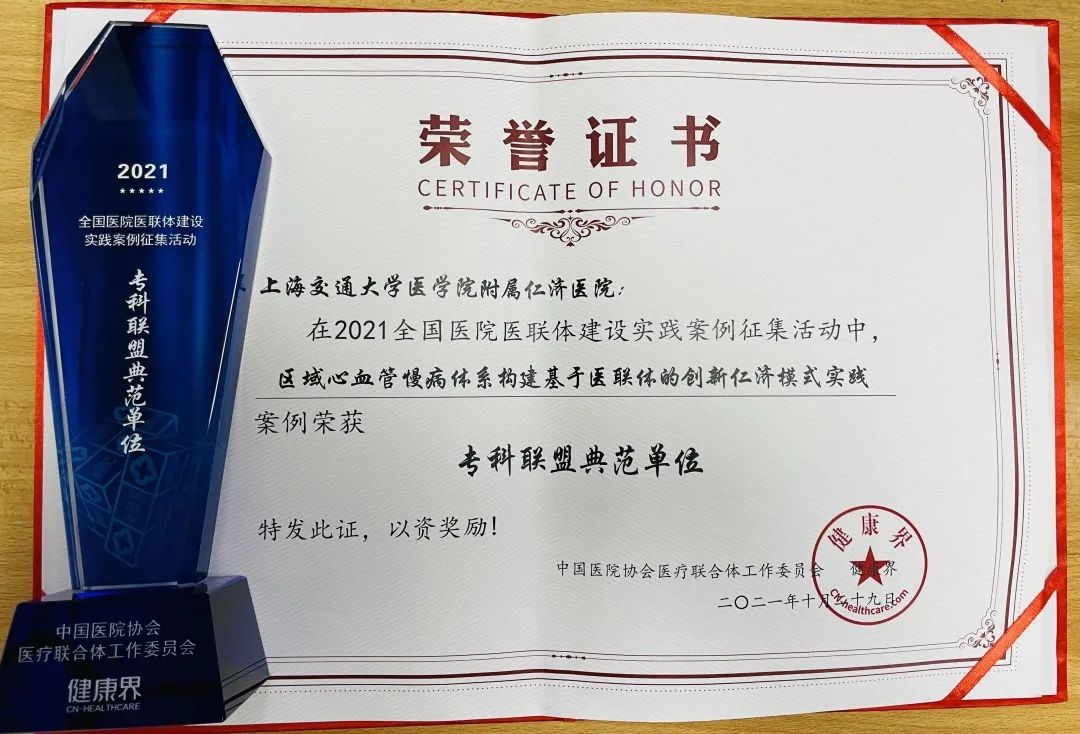 图片2:2021年10月29日,由医务一处牵头、与心内科联合申报的《区域心血管慢病体系构建基于医联体的创新仁济模式实践》医联体建设实践案例荣获“专科联盟典范单位”称号。
