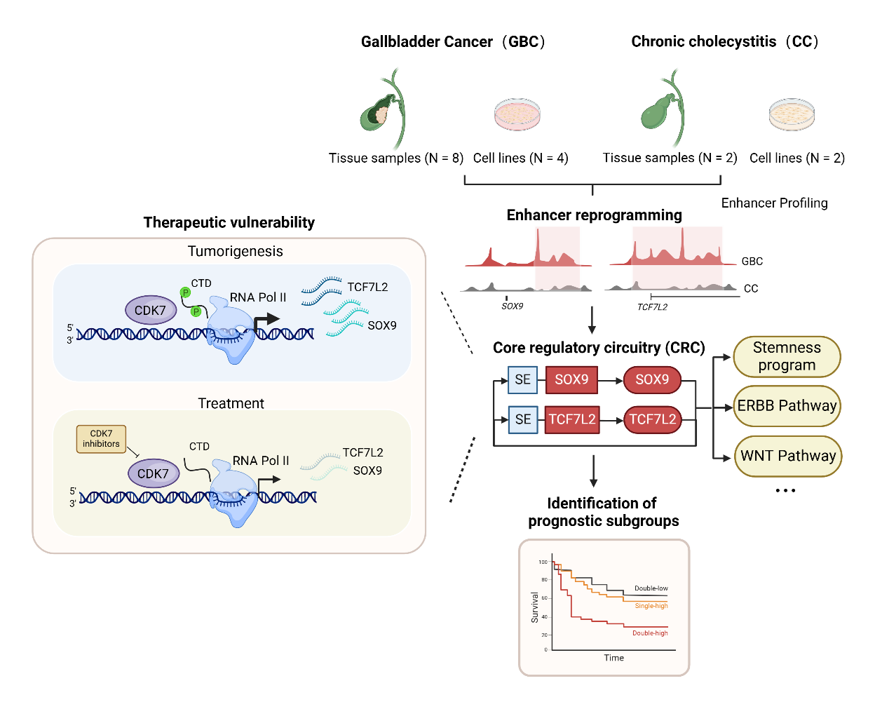 超级增强子(Super Enhancer, SE)是一类近年来发现的重要表观遗传调控元件,由谱系特异性核心转录调控网络(Core Regulatory Circuitry, CRC)驱动,其重编程可引发癌症中转录失调。因此,系统解析胆囊癌中的超级增强子分布和功能,并阐明胆囊癌核心转录调控环路,以及它们对表观遗传靶向药物的敏感性,不仅可以帮助深入剖析胆囊癌发生及存活的致病分子机制,还能为个性化分子诊断与靶向治疗提供全新思路。