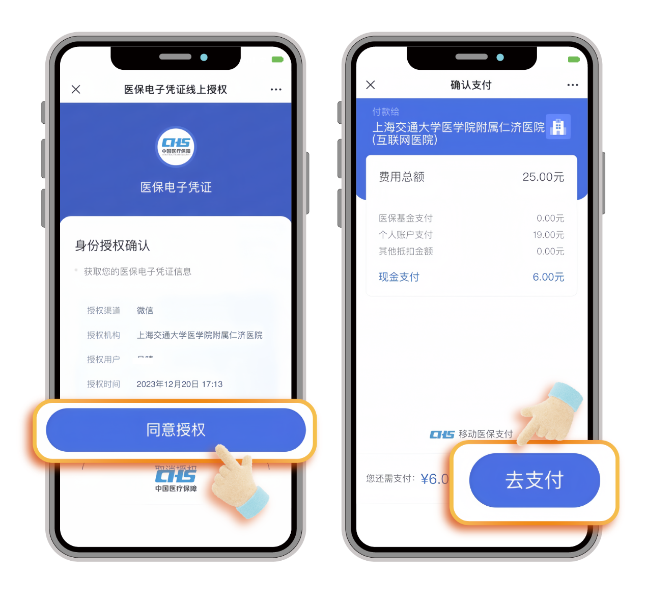 医保卡挂号,跳转【医保授权】页面,点击“同意授权”按钮,跳转【医保支付确认】页面。
