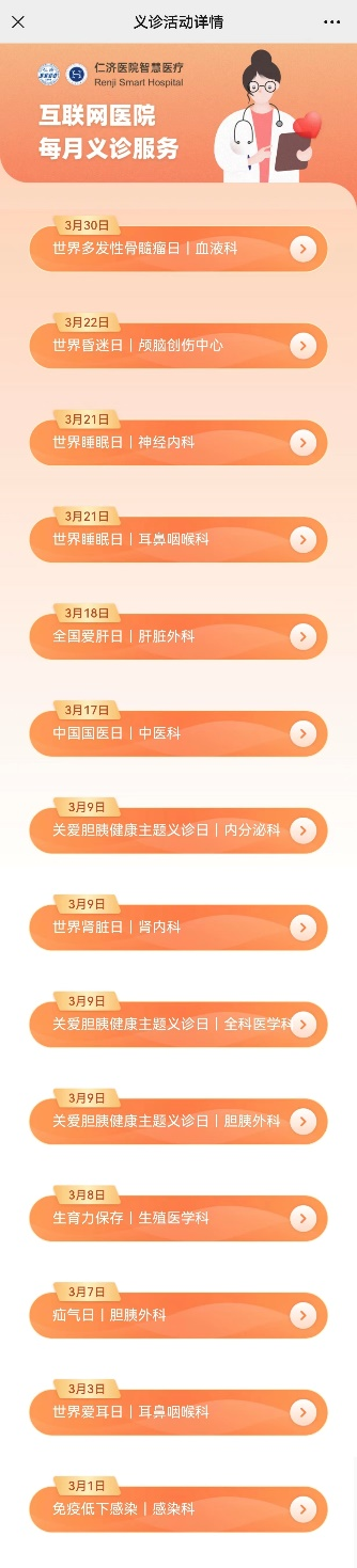 进入【互联网医院】-【每月义诊服务】版块,您足不出户就可以找到当日义诊专家,获得就诊咨询、配药到家和随访等服务