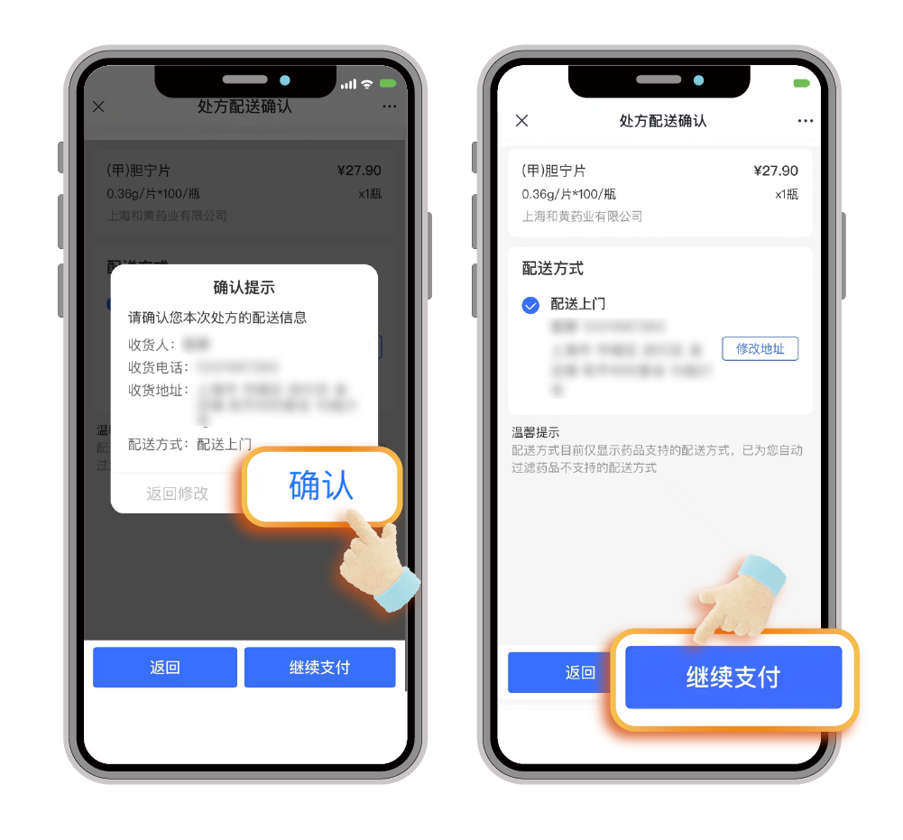 患者支付的医嘱单中包含处方单,页面展示处方药品支持的全部配送方式。患者可根据自身需求,选择配送方式并点击【继续支付】按钮,继续支付医嘱。