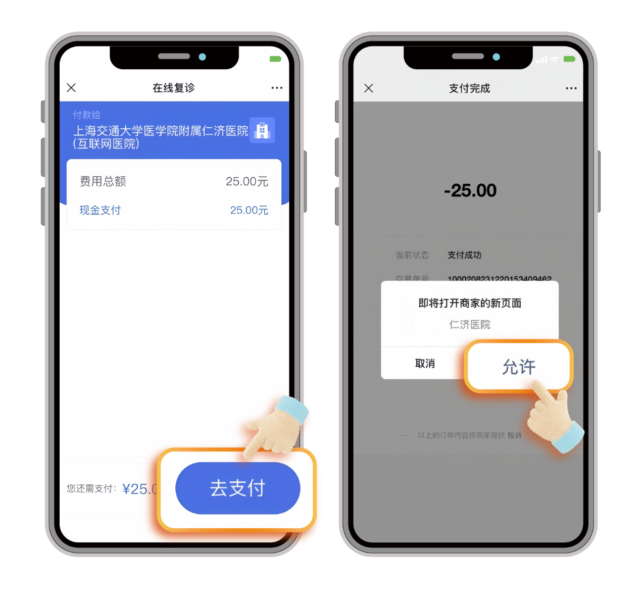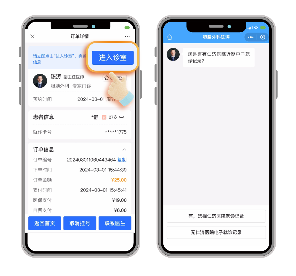 自费卡挂号,跳转【自费支付确认】页面,点击【去支付】按钮。支付完成,点击引导弹窗【允许】按钮返回,挂号付费完成,跳转订单详情页面,用户可查看订单详细信息,点击“进入诊室”按钮,完善就诊信息。