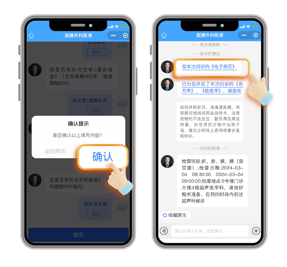 就诊信息完成确认弹窗,点击【确认】按钮,保存提交就诊信息完善内容,等待医生接诊,请留意医生的回复信息。