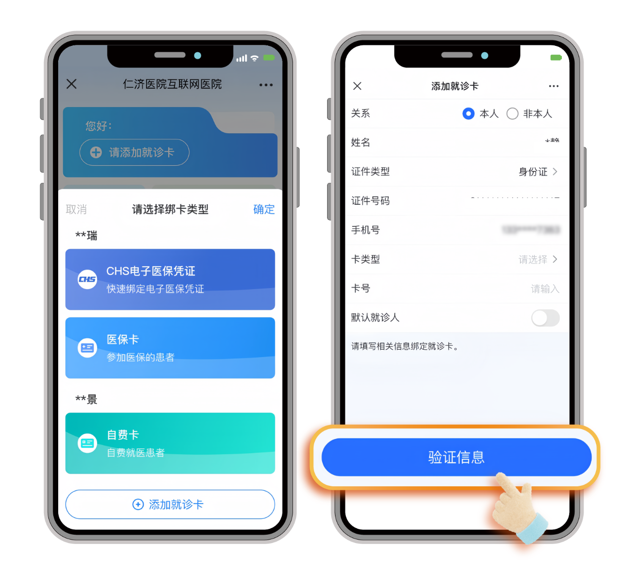 2. 新用户没有就诊卡,点击就诊卡选择区域,跳转【添加就诊卡】页面,输入“关系”、“姓名”、“证件类型”等字段,点击【验证信息】添加就诊卡。