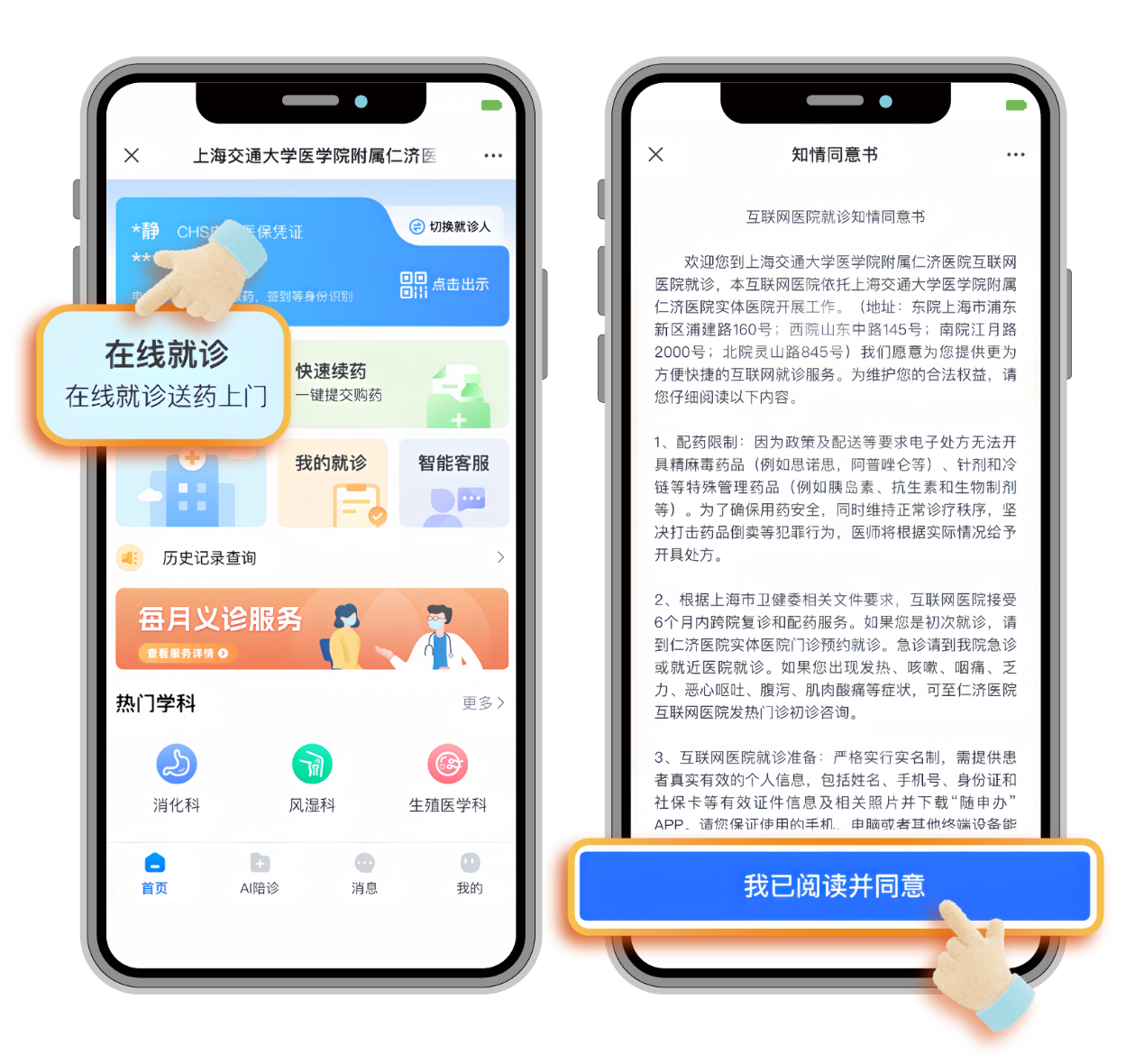 首页点击【在线就诊】服务入口,进入在线就诊服务,阅读知情同意书,并点击【我已阅读并同意】按钮。