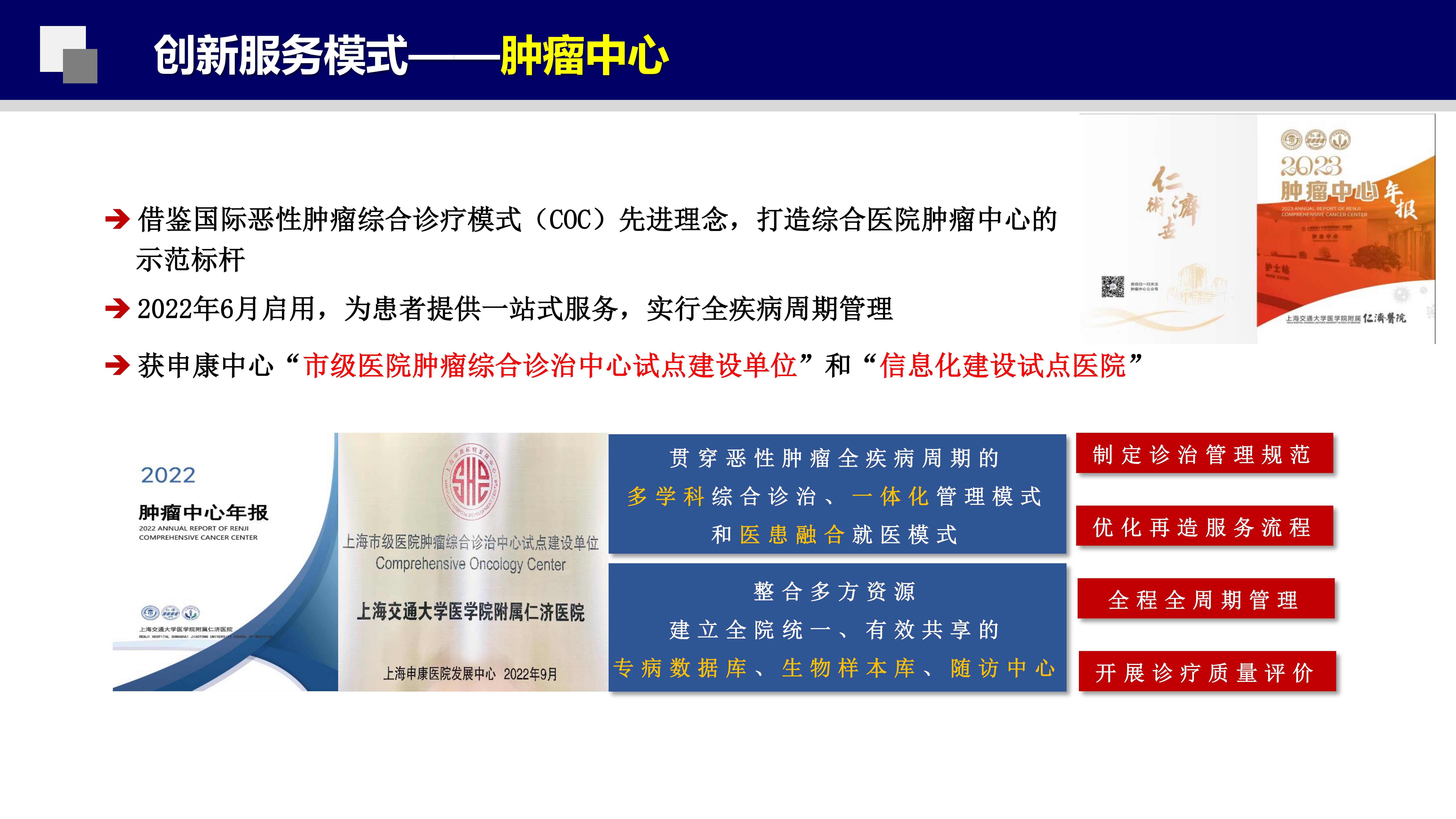 上海交通大学医学院附属仁济医院秉承“仁术济世”和“以病人为中心”宗旨,充分整合综合性医院多学科优势资源,利用互联网、医联体和肿瘤专科联盟等平台进行一体化管理,创新诊治模式,倾力打造集肿瘤预防、筛查、诊断、治疗、康复及心理干预等于一体、医教研防管全方位发展的肿瘤防治中心。通过全生命周期管理,为各种肿瘤患者提供规范化、个性化诊治服务,最终实现肿瘤患者生存期和生存质量全面提升的建设目标。