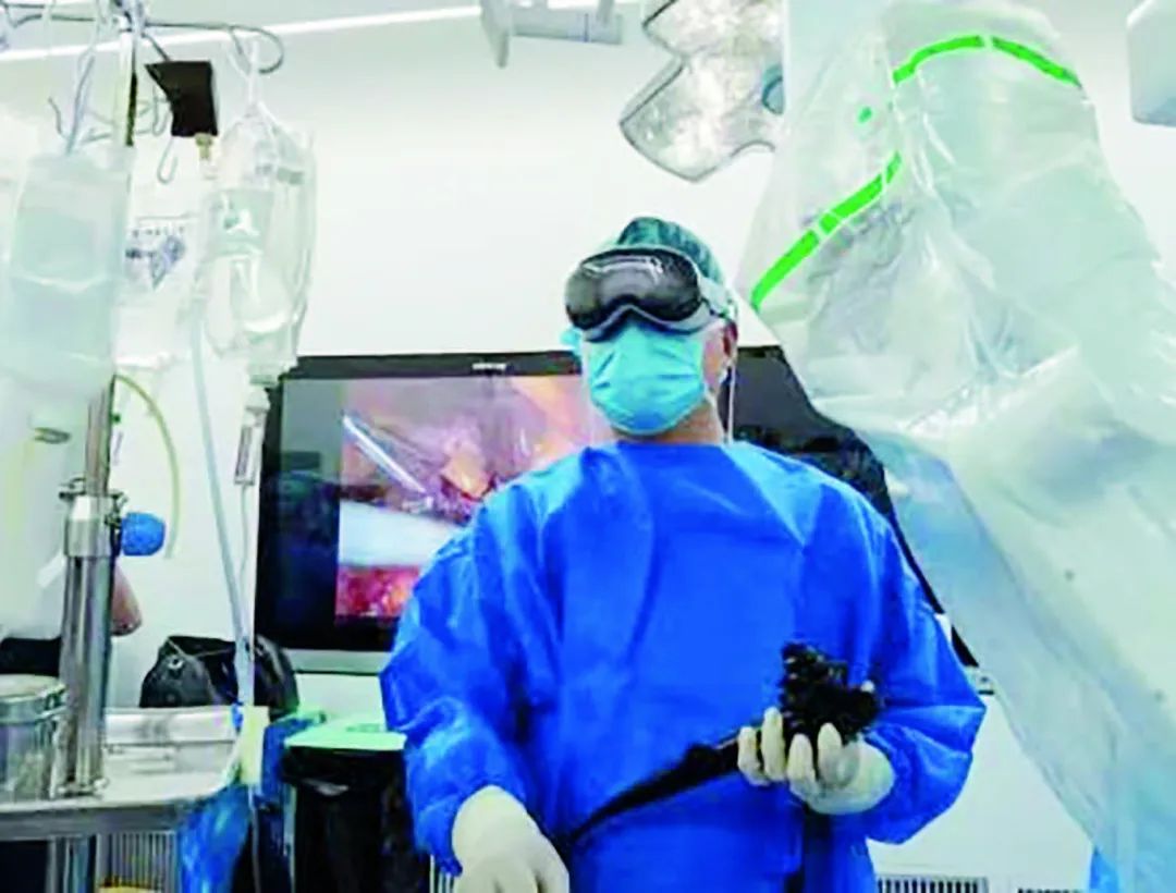 为了最大程度保证手术的精确性和安全性,张子臻想到了用空间计算技术解决手术难题——通过一系列复杂环境下的压力测试,将手术机器人和全高清电子内镜影像信号低延迟输入空间计算设备。手术时,内镜下肿瘤切缘定位、腹腔内的吻合器切割位置、机器人机械臂的食管胃底牵拉得以在同一视野下呈现。最终,手术顺利完成,术中冰冻结果显示切缘无肿瘤。