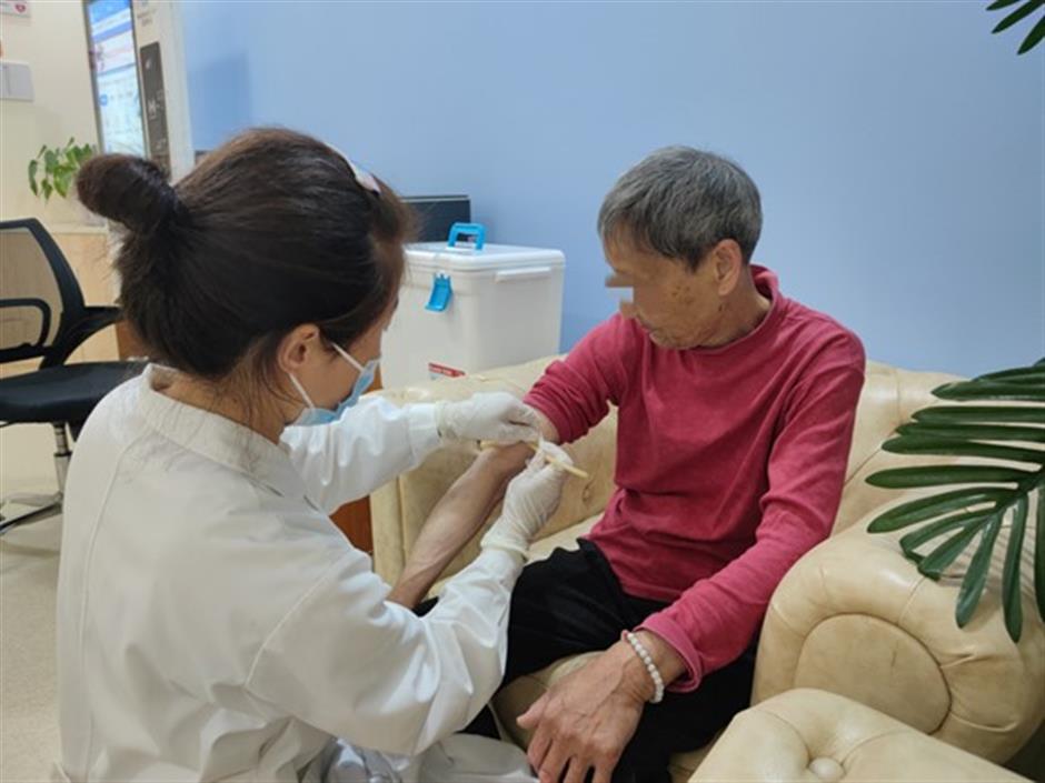A blood sample is taken from an old person at Mingchuan Nursing Home to be sent for testing at Renji Hospital.