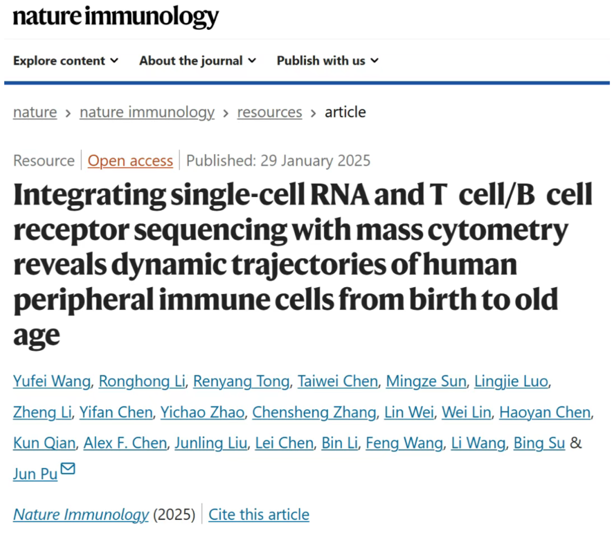 January 29, 2025 — A groundbreaking study led by Prof. Pu Jun’s team at Shanghai Jiao Tong University, published in Nature Immunology (IF=27.8), has mapped the dynamic evolution of human peripheral immune cells across the entire lifespan—from birth to old age—using an innovative integration of single-cell RNA sequencing (scRNA-seq), T cell/B cell receptor (TCR/BCR) sequencing, and mass cytometry (CyTOF). The research, titled “Integrating single-cell RNA and T cell/B cell receptor sequencing with mass cytometry reveals dynamic trajectories of human peripheral immune cells from birth to old age,” provides unprecedented insights into how the immune system matures, functions, and declines over time.