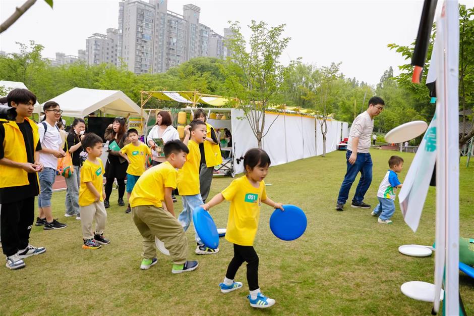 Children and their parents participate in a healthy eye event organized by the Shanghai Health Commission on Saturday.